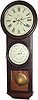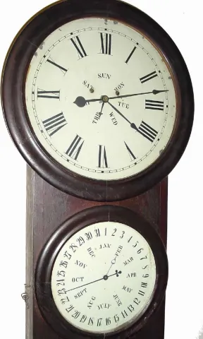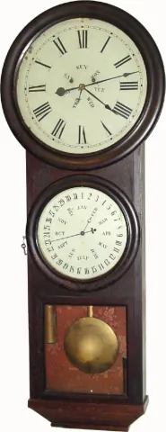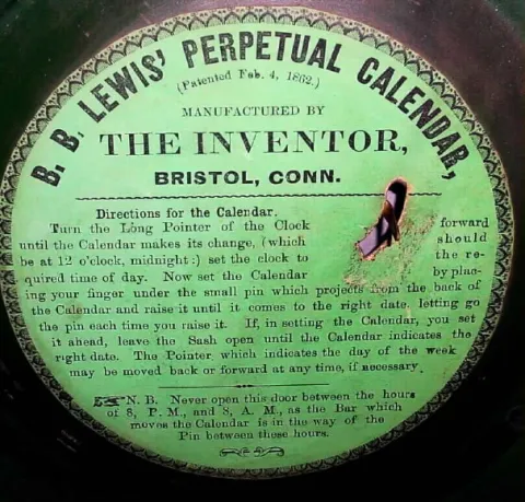 C.1865, L F and WW Carter, Bristol, Conn, Round Drop Wall Calendar, double dial.