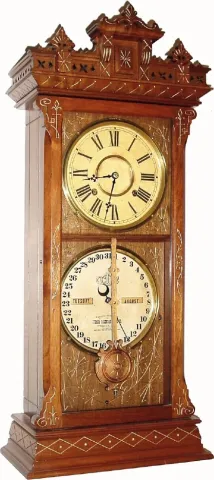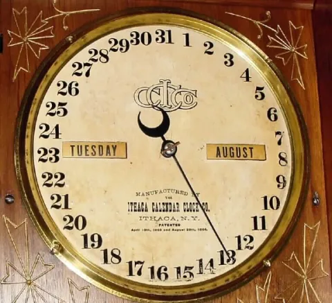 C.1880, Ithaca Calendar Clock Co., No. 6 1/2 Shelf Belgrade, double dial calendar clock, in excellent condition.