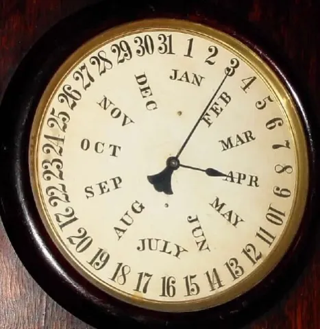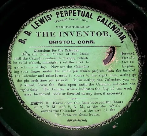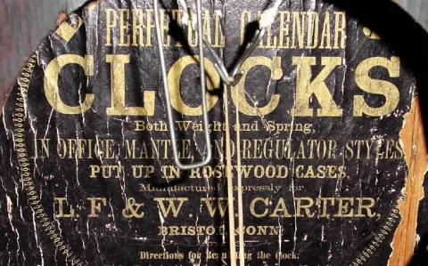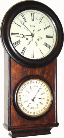 C.1865, L. F. and W. W. Carter, Bristol, Conn., 8-day weight double dial calendar wall clock.