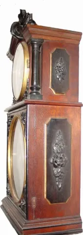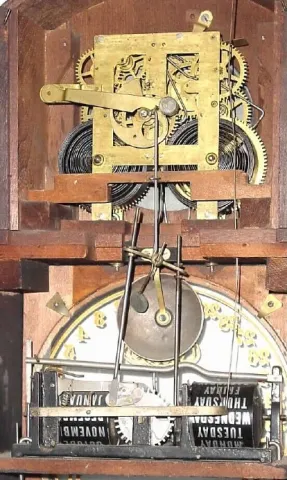 This clock needs a little more TLC, but will respond to some careful work. The back dust cover got lost and has been replaced with a piece of mahogany...