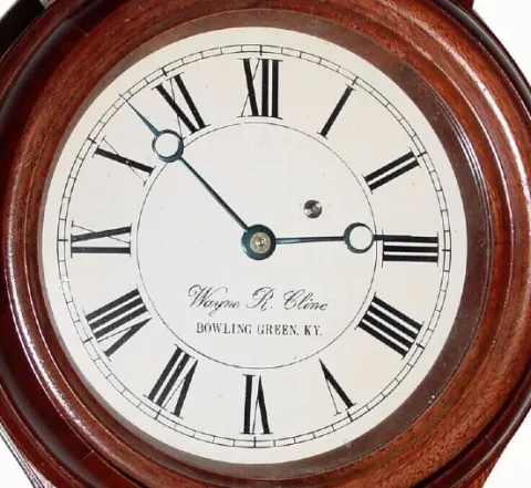 C.2000, Wayne R. Cline, Bowling Green, KY, miniature figure 8 walnut wall clock in shape of an E. Howard No.10.