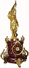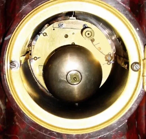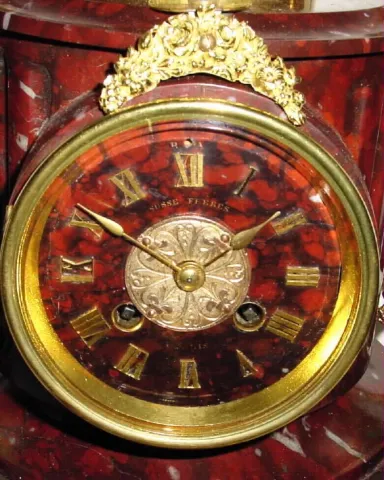 This is a nicely restored example, the mounts and statue re-gilded. The dark red and gray marble base has a matching dial with raised bronze numerals....