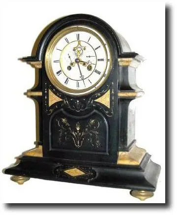 in a black marble clock with tan onyx accents. The only minor shortcoming on this is that the left dial grommet (brass) has gotten lost. Otherwise this is an attractive and well made clock with the unusual feature of day and date on either side of the open escapement. This is a simple calendar (adjust manually for short months). The incised case retains much of the original gilt accent, and with bronze bun feet. Height 15" Reserve $850