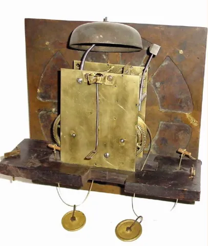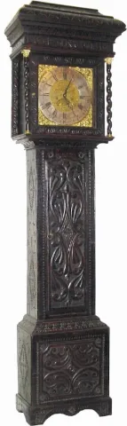 The case of this clock is heavy oak, carved in country fashion, a geometric scrolly design, the hood with the admonition: "Lose No Time". Note the car...