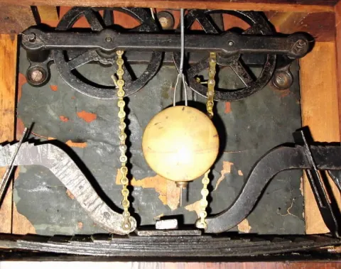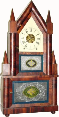 C.1848, Birge and Fuller, Bristol, Conn., 8-day wagon spring steeple on steeple shelf clock.