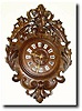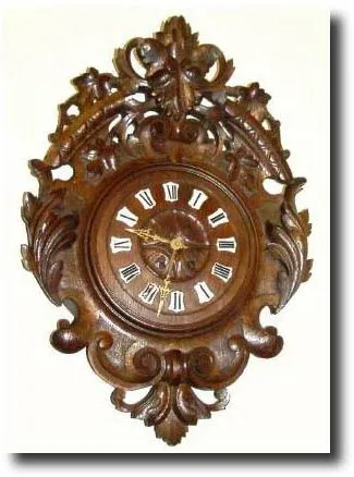 8-day time and strike on a gong. The hand carved frame is profusely carved with grape leaves and scrolls, and is very 3-dimensional. The 8" wooden dial has 12 porcelain signet numerals, in good condition. The well made French movement had the tip to the minute shaft broken and the minute hand was peened on in place long ago. Now that the movement is quite dirty, you will have to attend to the shaft in order to run the clock (the movement is otherwise sound). Every thing on the clock is original, and if you want this as a decorator, it's about as nice as they come. Height 26" Reserve $600