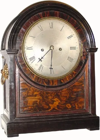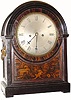 This is an attractive clock with lively kingwood veneer and ebonized accents. The 7" silvered dial has an engine turned center with a very fine and sh...