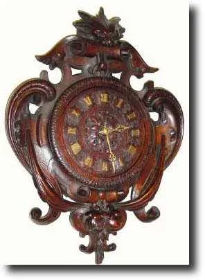 C.1890, French, Carved Oak cartel Clock in excellent original condition. The round oak dial plate has individual bronze numerals, all intact. The well made square French movement strikes the hours and halves on a gong. The case is deeply carved, a large depiction of the North Wind at the top and full size fruit at the bottom, and retains its original dark oak stain finish. Height 28" $500-700