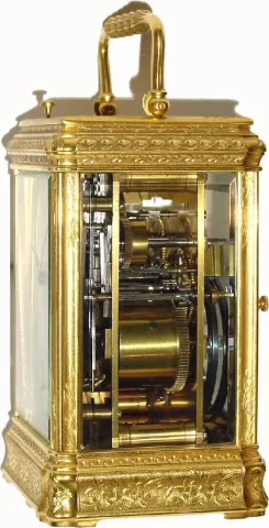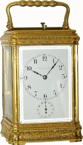C.1900, French, Ch. Hour for Tiffany and Co., brass cased carriage clock, grand sonnerie with alarm, and in an engraved and gilded gorge case of the highest quality.