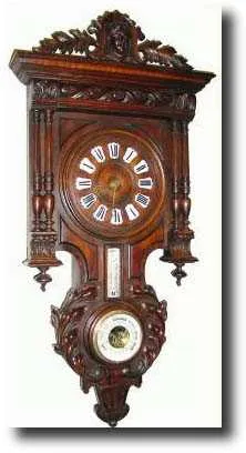 C.1890, French, Clock and Barometer cartel clock in excellent original condition. The walnut case has double columns up the sides, a frieze of carved scrolls above the dial, carved acanthus leaves around the barometer and a carved top of Diana with leafy accents either side. The well made Aneroid barometer has a porcelain dial with indications in French. This clock is right out of a house and has not been serviced in many years. Still ticks and tries to strike, but will need cleaning. About as nice a looking clock as you will find. Height 38" $500-800