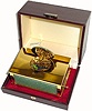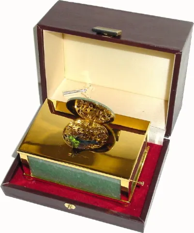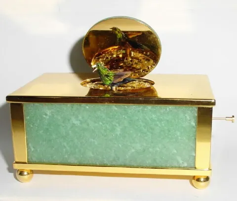 C.1975, Swiss, Reuge Music Co, St. Croix,singing bird box in a polished jade and gold plated case, in original leather covered presentation box.