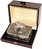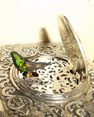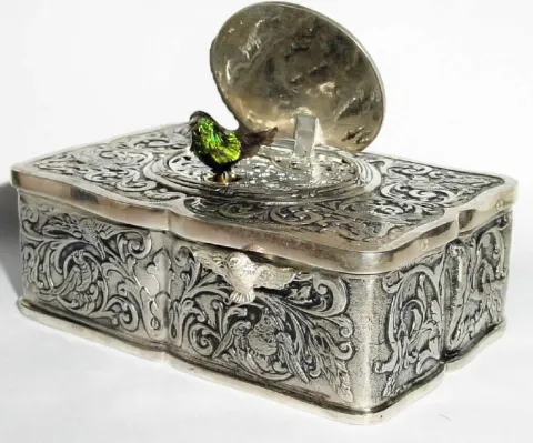 This silver case does not have the fine detail of older silver boxes, but there are still swirling floral designs on the side and engraved birds on th...