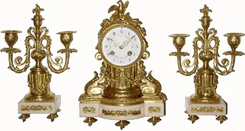 marble clock set. This is a nice small set suitable for a ladies dressing table or other bedroom furniture. There is a dove in flight atop the clock a...
