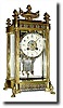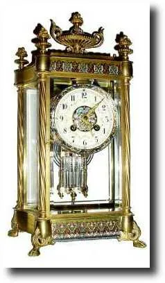 with convex sides, twisty columns at each corner, paw feet and floral finials. This is an exceptional brass and glass clock, with enamel work (dark red, blue, aqua and white) on the dial center, bezel, pendulum, top and bottom bands, as well as the fancy urn on top. The well made round movement is signed simply "Made in France" and with number 1391. Striking the hours on a coiled flat wire gong. This clock is from a home outside Philadelphia and has been in regular use. Height 15" $1750-2250