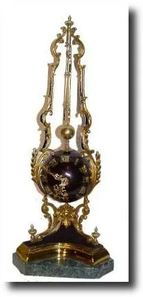The movement is contained in a brass sphere, painted dark blue. The pendulum is suspended from a silk yoke and rotates above the movement. The trefoil base is gilt wood, with a marble support beneath that. The movement appears to be clean and the clock is running and keeping time (these are not perfect time-keepers). There is a brass scab repair to one of the brass uprights (only visible on close examination). Height 16.5" These usually sell for around $3000. Reserve $2100