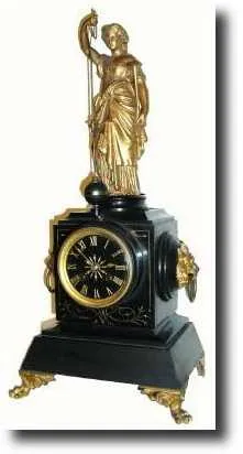 in very good original condition. This is a great clock with signed movement, and good gilding; the statue has an old repair for a broken left arm that has been painted over. Nice black marble dial with incised and gilded numerals and original gilt hands. Note this is a small clock; dial is only 3", yet is very well made with ormolu feet and case trim. Strikes the hours on a bell. Height 20 inches $3750-4250