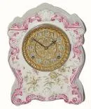 This is an attractive clock with dark pink accents; much of the gold highlight has worn away. Floral decorations are yellow and dark pink dahlias, bel...