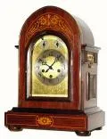 C.1910, German, Junghans, 8-day Westminster chime mahogany inlay mantle clock (also a fine band brass accentuates the edge of the case).