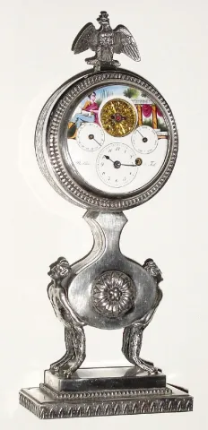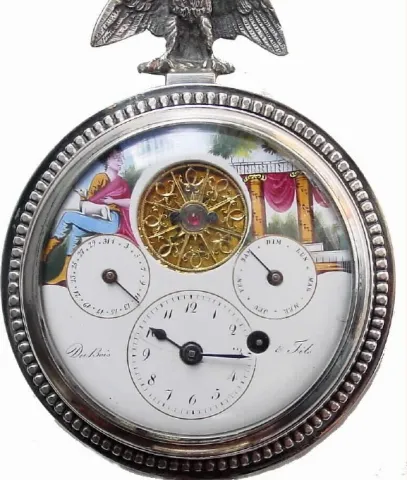 C.1830, Swiss, DuBois and Fils, Small Silver Desk clock with key wind calendar movement (watch size).