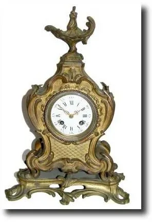 a once elegant ormolu mantel clock that has been polished weekly by the made and only traces of the original gilding remain. Having said that, this is a clock of high quality, the case with "built in" base, and all tips and extensions are intact. The well made round lever movement is signed Tiffany and Co, New York on BOTH the dial and rear plate. One side strap that holds movement has failed and needs renewing. This clock will restore to an elegant piece. Height 16" Reserve $500