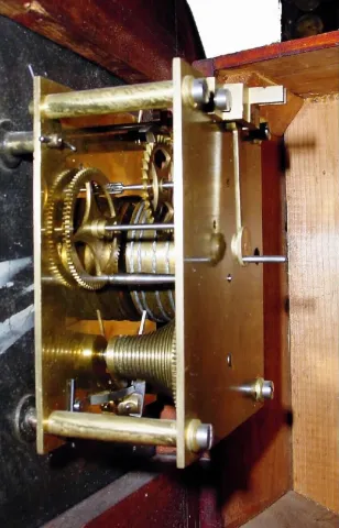 The mahogany case has been refinished. The painted dial is very clean with a little scratch on one edge. The bezel has been re-soldered where it is mo...
