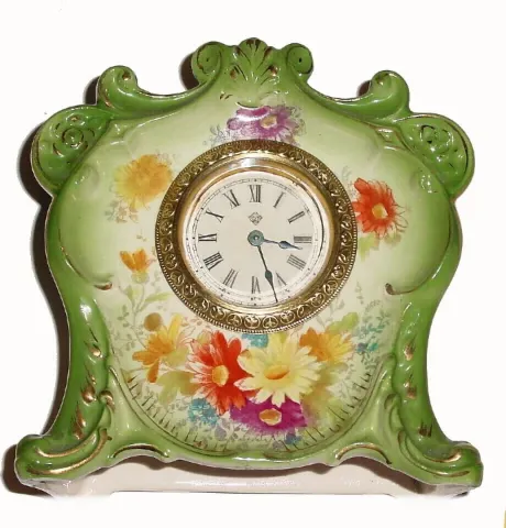 C.1904, Ansonia Clock Co., "Goblin" 30-hour Royal Bonn porcelain timepiece in very good original condition.
