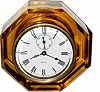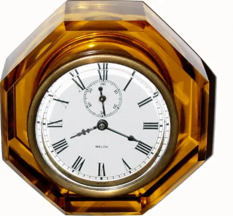 The amber cut glass case is in perfect condition. The porcelain dial is perfect . The minute hand is a replacement. This model has the seconds dial at...