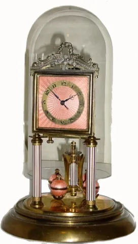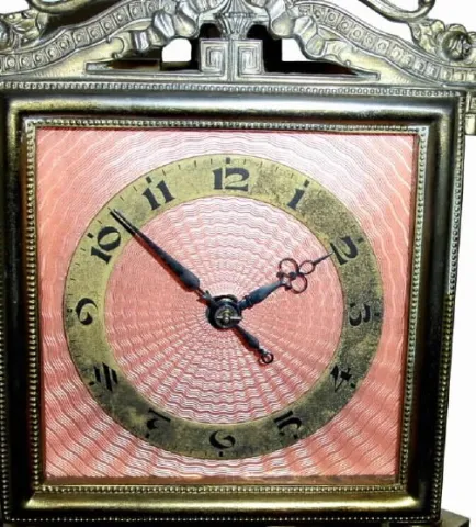 This is an attractive with a pink enamel over damascene silver dial and applied brass chapter ring. The columns are brass with white enamel stripes. T...