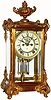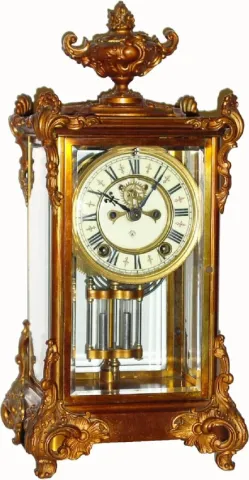 Note this clock has been sprayed over with an antique gold paint, and the fancy spelter finial on top is bent slightly to one side. Also both bottom n...