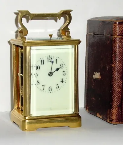 time, strike and repeat in original carry box (less handle and with wear). This clock was sent out for service and the repairman broke one side glass....