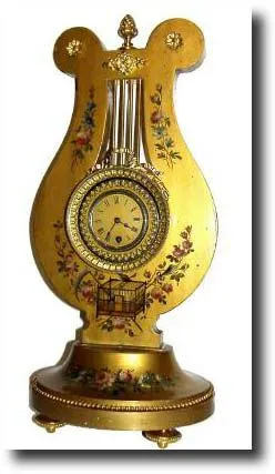 with very unusual pendulum ring that rotates back and forth around the margin of the dial. This "pendulum" is really acting like a giant balance wheel, with gilded fleur-de-lis all around the margin to give it avisual appeal. The well made Lot 429 movement is signed "GLT" (Guilmet), and with number 593. The gold lacquered case is decorated with flowers, and with tasteful ormolu trim and feet. We have never seen this model of lyre before, with rotating rather than oscillating ring. Running briskly. Height 19" Reserve $3500