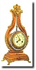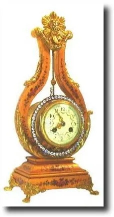 C.1890, French, Gilt-wood Lyre Clock, with traditional ring of brilliants which swings as the pendulum. The case decorations are similar to those of the previous lot, with more profuse display of flowers, and with ormolu mounts and feet. This is a miniature size clock, only 14" high. The well made movement strikes the hours and halves on a bell. The porcelain dial is 3 inches in diameter, and with polychrome floral decorations. The clock is running. Reserve $2500