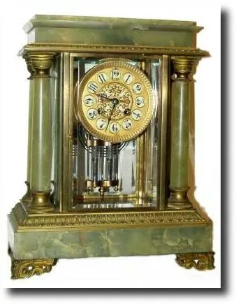 C.1890, French, Green Onyx and Ormolu, Crystal Regulator in very good condition.There are minor corner chips on the onyx, and the rear beveled glass is chipped; otherwise this is a great original clock with a substantial look. Note fancy dial of white glass or marble, overlaid with a gilt ormolu mask, with an opening for each numeral (dial has dark spot below 6). Original mercury pendulum intact. All 4 columns are full round and free standing with gilt bronze capitals top and bottom. Well made round mov't, serial no. 10159-411, strikes the hours on a flat wire cathedral gong. Height 13" Reserve $750