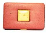 New Haven jewelry box with clock. Extra nice pink leather case, key lock, brass clock and brass trim.