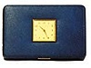 New Haven jewelry box with clock. Extra nice blue leather case, key lock, brass clock and brass trim.