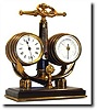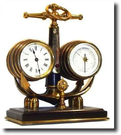 with barometer and thermometer. The platform 8-day movement sets in the left barrel (with gilt staves) , with a 2" white porcelain dial, and is in good running order. On the other side of the anchor, in a matching barrel, is the Aneroid barometer (with hairlines in the porcelain scale). The whole on a stepped black marble base with gilt brass footing. Clock is running. Height 9" Reserve $1200