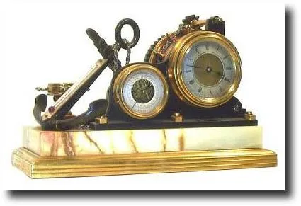 C.1890, French, Industrial "Ship's Winch" Desk Set. The clock sets in the winch with winding arbor and pawl above, a chain draped round the winch and through the top of the anchor. The shank of the anchor carries a thermometer, and behind stands a compass. The whole mounted to a veined white marble base with heavy brass footing. The case and tools with original tu-tone finish and the clock running. A sister to this clock may be seen in Derek Roberts' book: Mystery Novelty and Fantasy Clocks, (1999), page 265, figure 22-28-D. Height 6.5" Reserve $2500
