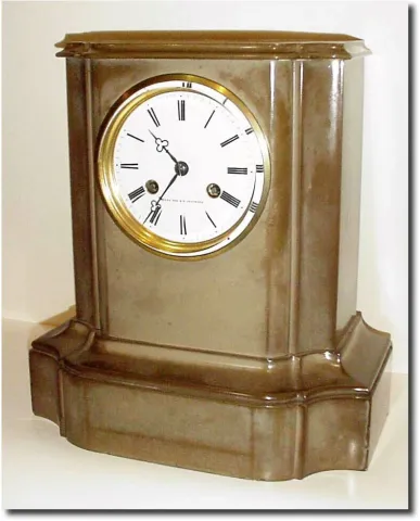 C.1890, French, Japy, for H. B. Stanwood (on dial), a grey marble mantel clock in very good condition, clean and running. The only thing that keeps this from being excellent is that the lower right return fell off (now reglued) and a hunk of marble is missing from the return (not visible from the front). The porcelain dial is perfect and with original trefoil hands. Height 10.7'