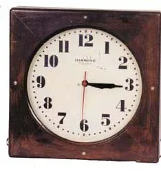 The back is on hinges for easy access to the movement and hand set knob. Ca 1950's, running. Excellent walnut case is 19 inches square. Painted metal ...