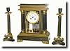 C.1890, French, Marti, Bronze and Ormolu crystal regulator mantel clock set in excellent original condition. The porcelain dial has no chips and retains polychrome floral wreaths and original hands. Original mercury pendulum is intact. Best part are the matching candle stands also with original finish and patina. Height 13" $750-1000