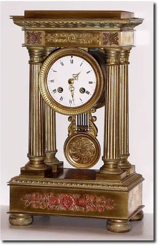C.1890, French, Marti, for J.E. Caldwell, Philadelphia (full signature on movement), a good ormolu 4-column Empire clock. The gilding has been polished off the case and there is a hairline in the dial from 10 to 7, and another around 3:30. Runs Ok and is quite impressive. Height 13.5'