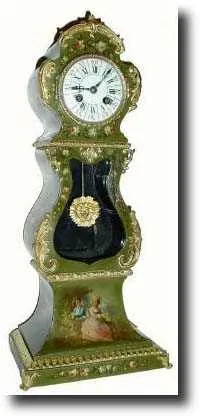 C.1890, French, Mini Tall Case clock finished in the style of Vernis Martin, muted green with delicate painted flowers on the side and a couple on the base in front. Note this clock fell off the mantel at some time and broke in 2 across the center. It has been glued and no pieces were lost, but the repair does show. Would be $1750 in perfect order; estimate reflects condition. The movement signed Trouille a Amiens; runs and strikes on a bell. Height 17" $750-1000