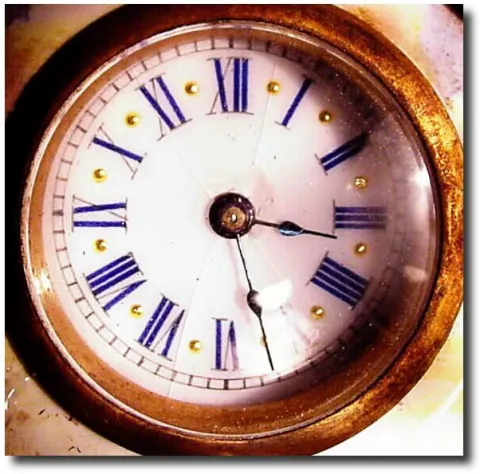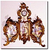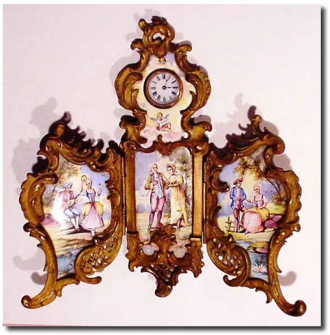 C.1890, French, Miniature "Screen' in the Louis XVI style, with a watch movement providing the time on a tiny porcelain dial with blue numerals. The original gilding on the ormolu is very good (outer edges with wear), and the 30-hour movement is clean and going. There is a tiny old repair, almost unnoticeable in the porcelain panel surrounding the dial (below 8). The other panels are perfect, their delicate hand painted scenes depicting lovers singing and lovers in repose, and around the dial, angels singing in the clouds. Note close-up area is one inch wide. Height 7'