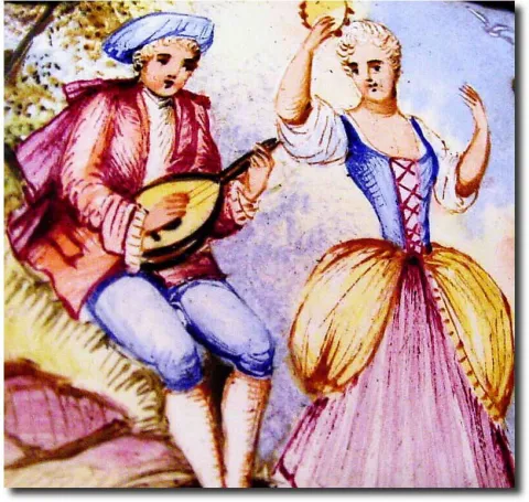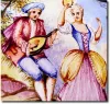 The original gilding on the ormolu is very good (outer edges with wear), and the 30-hour movement is clean and going. There is a tiny old repair, almost unnoticeable in the porcelain panel surrounding the dial (below 8). The other panels are perfect, their delicate hand painted scenes depicting lovers singing and lovers in repose, and around the dial, angels singing in the clouds. Note close-up area is one inch wide. Height 7'
