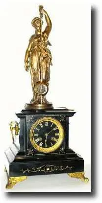 C.1890, French, Mystery Clock, Traditional bronzed spelter statue, holding pendulum which swings with no apparent impulse. This clock is in good running order, however, the pendulum is a modern replacement; this is one item on mystery clocks that simply has to be made if it is missing. There are some minor chips in the case, but it retains all of its hardware in good condition, great orig gilding in the incised moldings, and seems to be in good running order. Height 24" $4250-4750