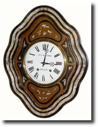 C.1890, French, Picture Frame Clock, with large, Morez, iron framed prayer repeat movement. The enamel over steel dial signed Alfred Augendre, Chateaumeillant. The outer frame is gesso over wood, false grained, and the dial surround is of walnut veneer with brass and mother of pearl inlay in excellent condition (usually the brass string is pulled out). Retains original hands, dial bezel, pendulum, etc. Note suspension spring has failed and will need renewing (leader is there). Minor nicks and scrapes to case and frame; nothing glaring; overall very good. If maintained, these heavy Morez movements will last 5 lifetimes; height 25" Reserve $300