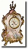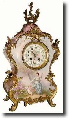 of Sevres quality, but unsigned, in the style of Louis XVI. Note the under side of the clock has a couple of small chips that do not show unless the clock is turned over. The front depicts a mother in the garden with her child, spinning wool on a hand spindle. The sides of the clock are decorated with 24k gold, a mandolin, arrow and ring on each side. The case is fully mounted with ormolu accents and feet and with a spray at top . The porcelain dial has a hand painted winged cherub with flowers and is perfect. Strikes on a gong; running. If this case were perfect, we would expect it to fetch $2000. Height 17" $900-1200