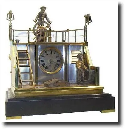 from the Industrial Series. The bronze and silvered case is in the form of a ship's quarter deck, set with a binnacled compass and a sailor with a coil of rope, another at the helm, the whole on a stepped black marble base on gilt brass feet. The two train signed French movement numbered 2178, and striking the hours and halves on a coiled gong. The helmsman forms the top of the compound pendulum and rocks back and forth with each tick. For reference see Sotheby's Meraux sale (6-28-93), lot 15, this same model sold for $13,225. Also see this model pictured in Derek Roberts' book: Mystery Novelty and Fantasy Clocks, (1999), page 255, and on the inside rear cover leaf, Mr. Roberts is setting at his desk with one of these clocks. Height 12 " Reserve $9000
