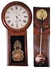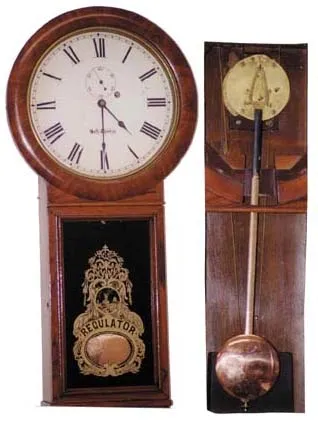 Round brass, 8 day movement by S B Terry, with seconds dial, ca 1852-1859 Pendulum is in front of the weight which is compounded in the top of the cas...