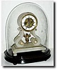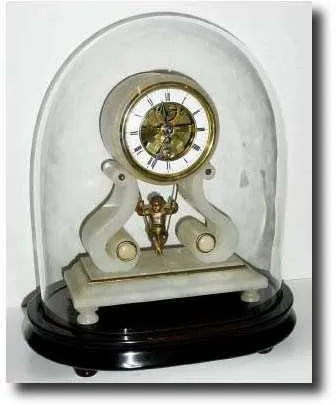 C.1890, French Swinging Doll Clock and Dome; this is a beautiful little alabaster clock with applied brass mountings. The porcelain dial is perfect and the clock retains its original swinging figure. The clock sits on a restored wooden base with an old glass dome. Note movement is visible through skeletonized dial. Height 9" $1000-1500